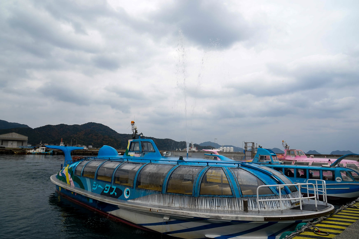 くじら形の船もいて、潮を吹いていた。かわいいのだが今日乗る船はこれじゃないです。
