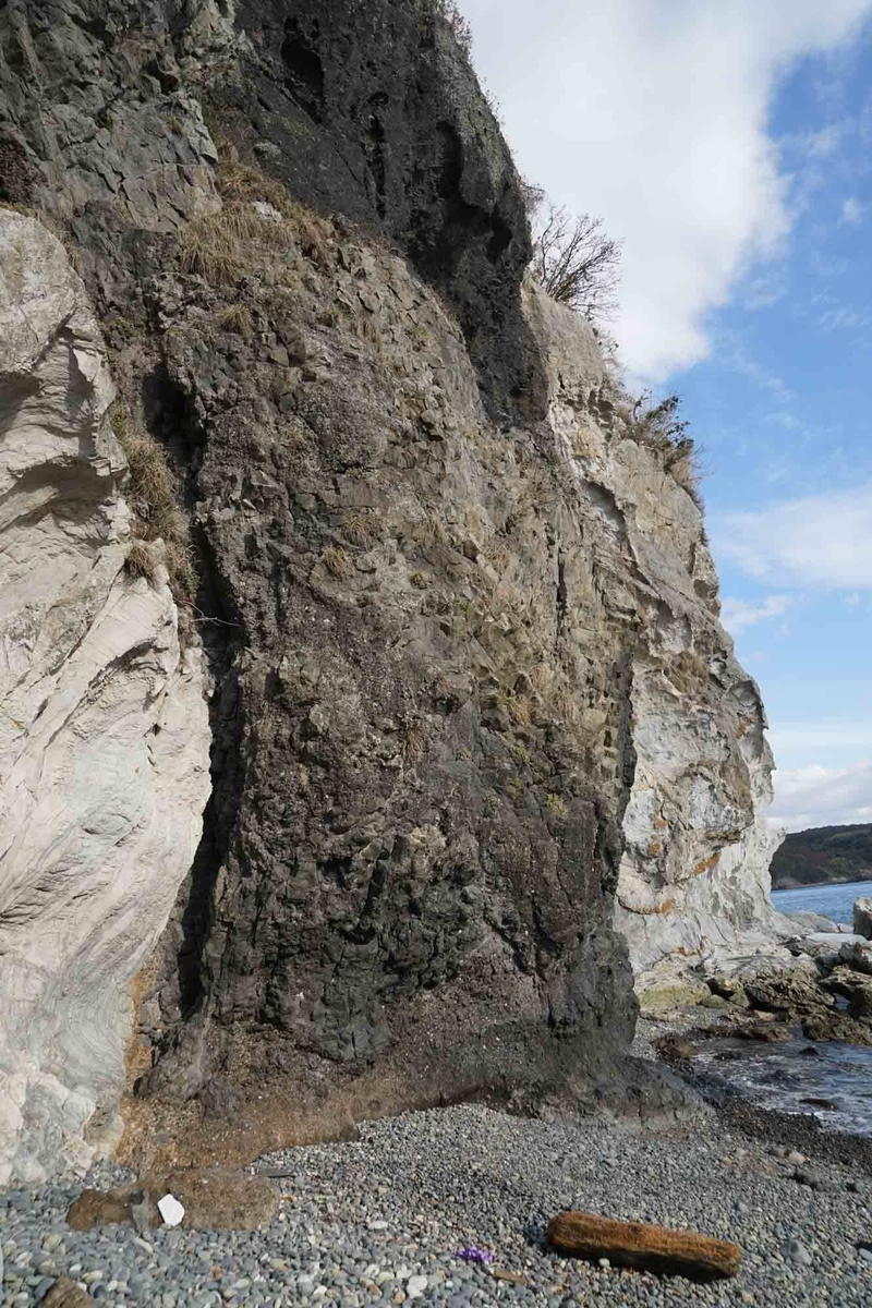 2日目は島の南端からスタート。まずはかっこいい岩から。 流紋岩(白)に玄武岩(黒)が貫入したもの。